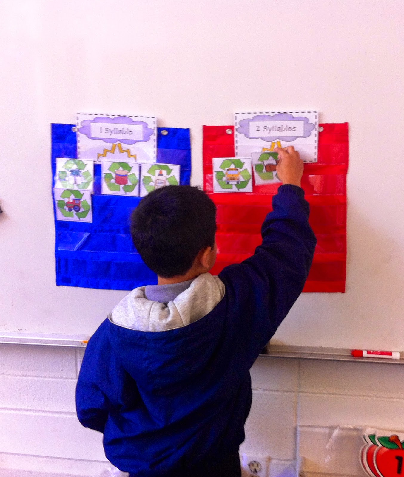 Our next activity was an Earth Day Syllable sort. I gave each of them a card with a picture on it and we took turns clapping out the syllables and then placing the card in the correct pocket chart.