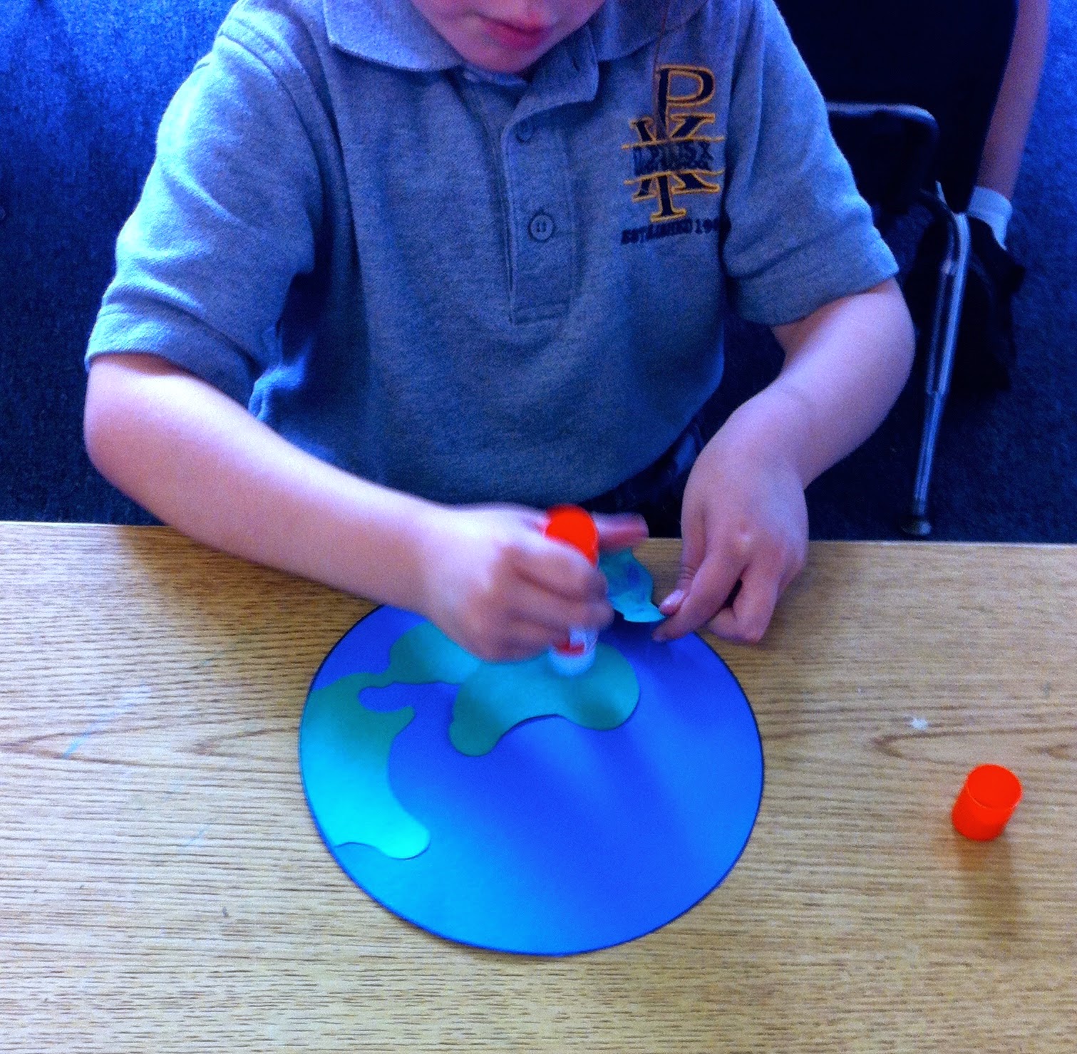 For the Earths, I gave them one green piece of land at a time and showed them where to glue it so that it would actually resemble our planet in some way: