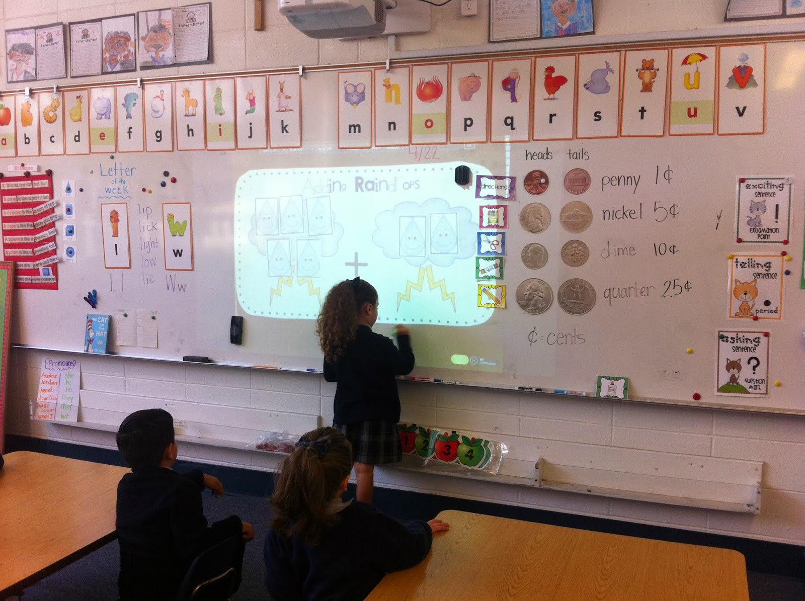 Next we did raindrop addition. I projected this little mat with two storm clouds on it and placed different numbers of raindrops on each side. Volunteers came up to the board to count, write the addition problem, and add: