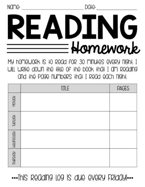 In the past, I have required my students to read for 30 minutes, five days a week and to keep a reading log and write one reader’s response per week (confusing…I know). This year I decided to try to make my life a little bit easier. I’m having them read for 30 minutes still but they only have to record it on their reading logs Monday through Thursday. (I can’t tell you how many of them, in the past, would be filling their reading logs out all week and then “lose” them over the weekend and get no credit). Here’s what my Reading Log looks like now: