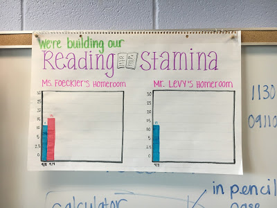 Because Fifth Graders love competition (at least mine do!) I talked to them about building our reading stamina as a class and made a chart of their growing stamina beside the chart for my other Language Arts class. Every day, after reviewing the expectations, I set a timer for a few minutes longer than the day before and reminded them that if anyone interrupted our reading time or stopped reading to look around or draw or whatever, that I would have to stop the timer and that would be the time that we would put on our stamina chart for the day. No one wanted to be the one that ruined it for the whole class, so this worked out very nicely. We started with 15 min and worked our way up to our goal of 30 minutes. Once we reached our goal, I started allowing them to sit on the floor, under their desks, or wherever they wanted as long as they continued to meet the expectations on our chart.