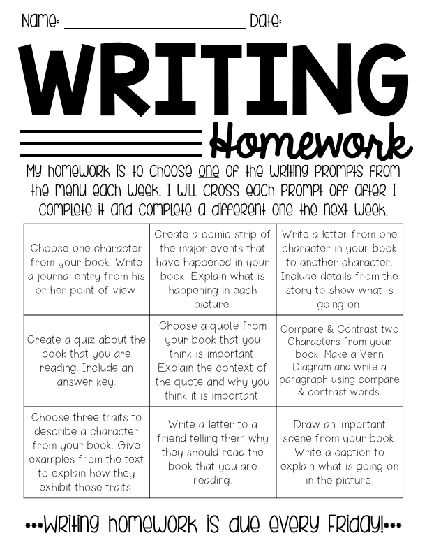 For writing, I’m having them choose a prompt from the “menu” each week to write about the book that they are reading at the time. This “menu” will last them nine weeks since there are nine prompts and each time that they complete one they have to cross it off and can’t do that one again.