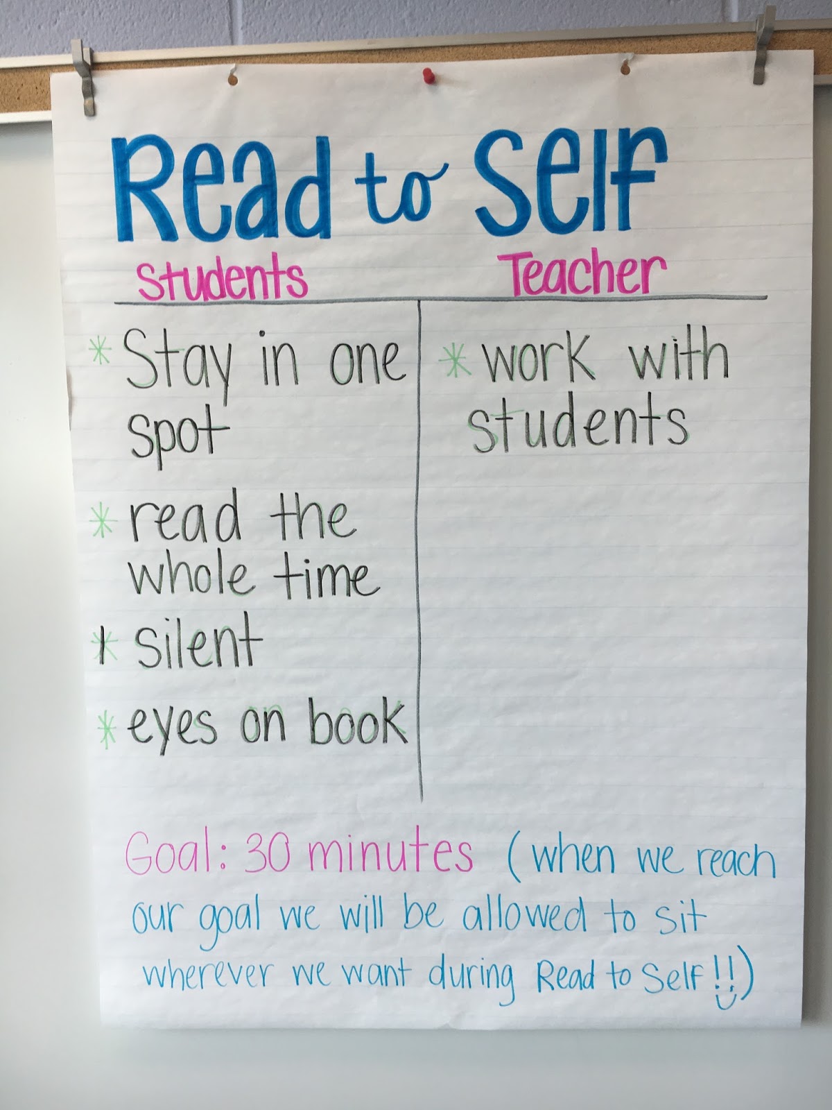 After explaining how important it is for them to work quietly while I pull students for testing, conferring, and/or small group meetings, we talked about what the expectations are during “Read to Self” time. I made them repeat these expectations to my every DAY for the first two weeks of school before we started reading and by the end of that time I had them reading for 30+ minutes without a sound in the classroom.