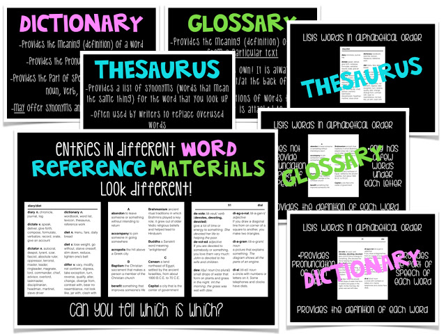 We started the unit off by talking about what Word Reference Materials are and then taking a closer look at dictionaries, glossaries, and thesauruses (that’s a fun one to say). We discussed what each one is, looks like, and the information that it provides us with.