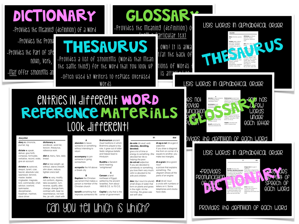We started the unit off by talking about what Word Reference Materials are and then taking a closer look at dictionaries, glossaries, and thesauruses (that’s a fun one to say). We discussed what each one is, looks like, and the information that it provides us with.