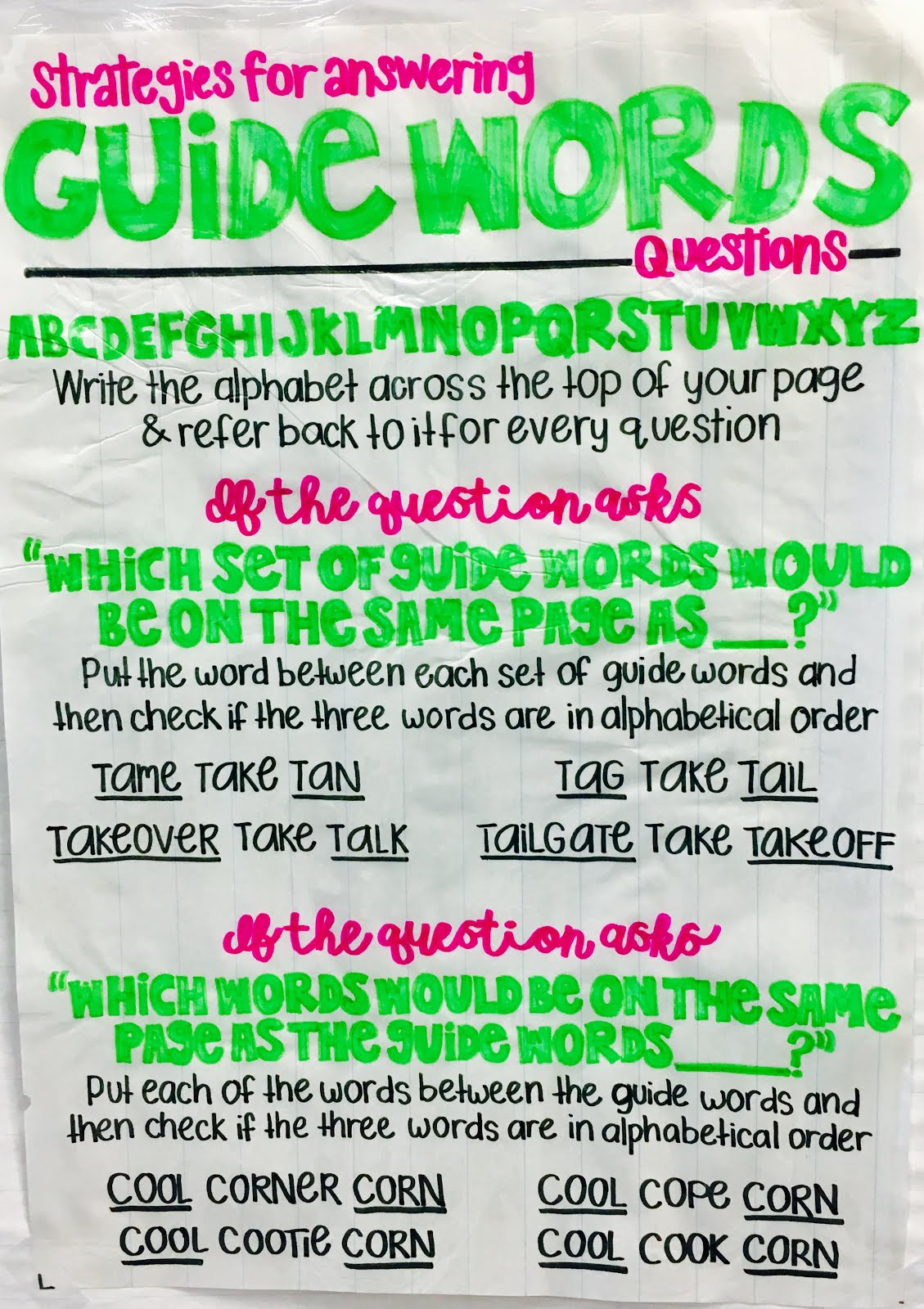 I’ve been trying to give them some strategies to tackle these questions like writing the alphabet at the top of their page, putting the words in between the guide words and checking the alphabetical order, etc… I even made them this little anchor chart to refer back to, which sadly got a little crumpled in the laminator.