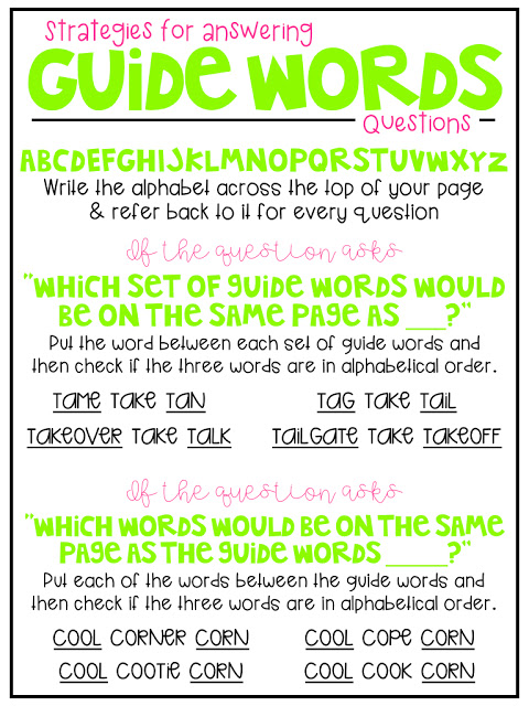 Last week I posted all about my Word Reference Materials unit which worked out really nicely for most of my kids, but I have a few who are really struggling with answering questions about guide words. They just can’t seem to wrap their mind around the fact that they need to alphabetize and check if a word comes after the first guide word and before the second guide word.