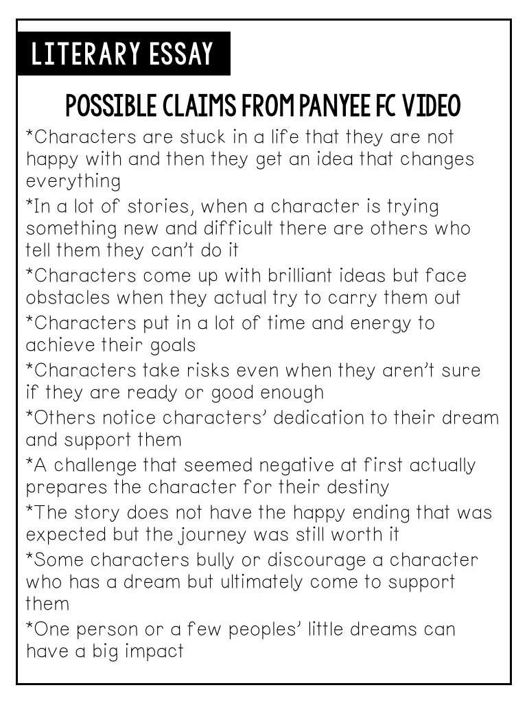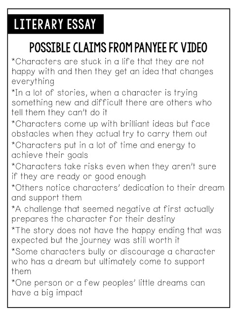 After watching the video a few times, I asked them to look for common themes, lessons, character traits, etc… I emphasized that one way to come up with a claim is to pinpoint something in the text/video that you have seen before and we discussed how the characters worked hard like the characters in many different stories and movies, how people didn’t believe in them at first which we see in a lot of stories, etc… Below is a list of all of the claims that we came up with: