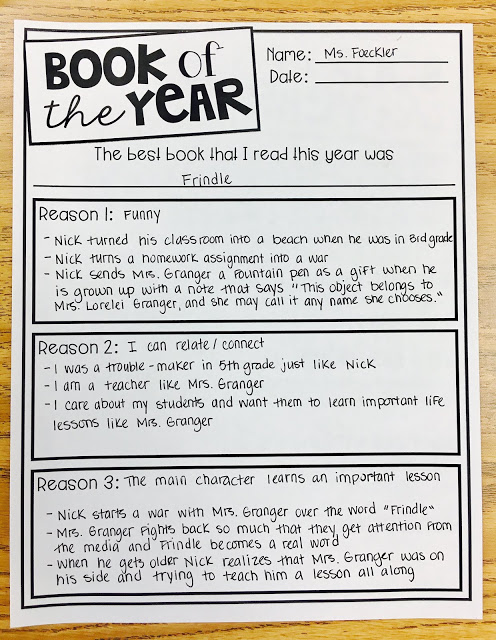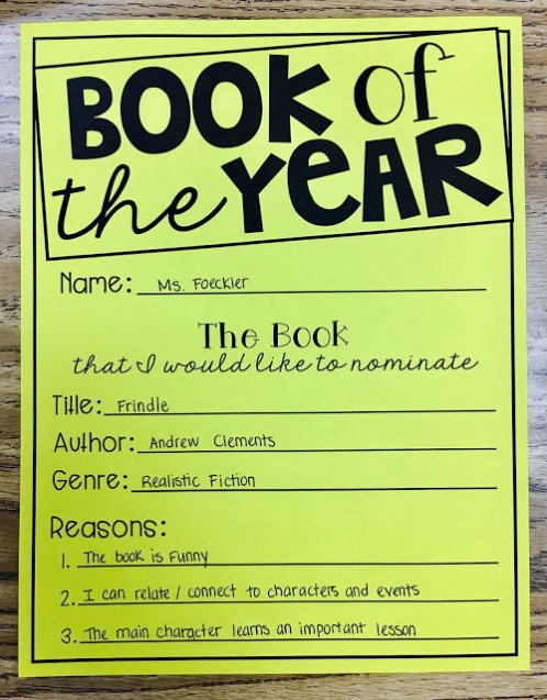 Today I wanted to share an end-of-the-year activity that my class is working on called the Book of the Year Project. For this project, students get to nominate their favorite book that they read this year, draw the cover of the book, and write an opinion piece explaining why the book is their favorite.