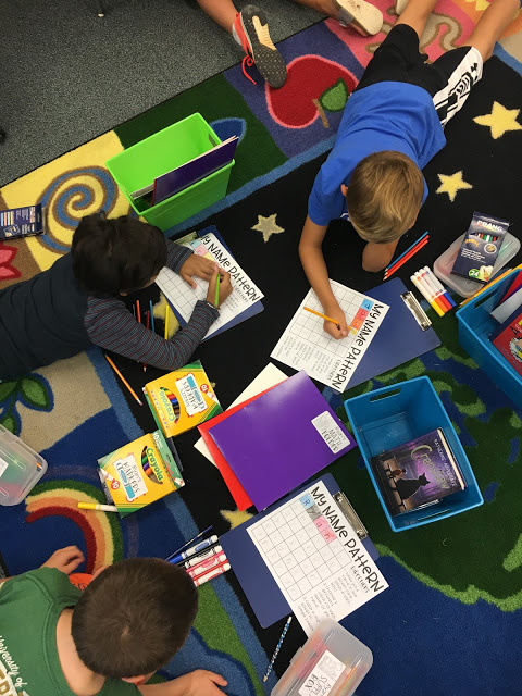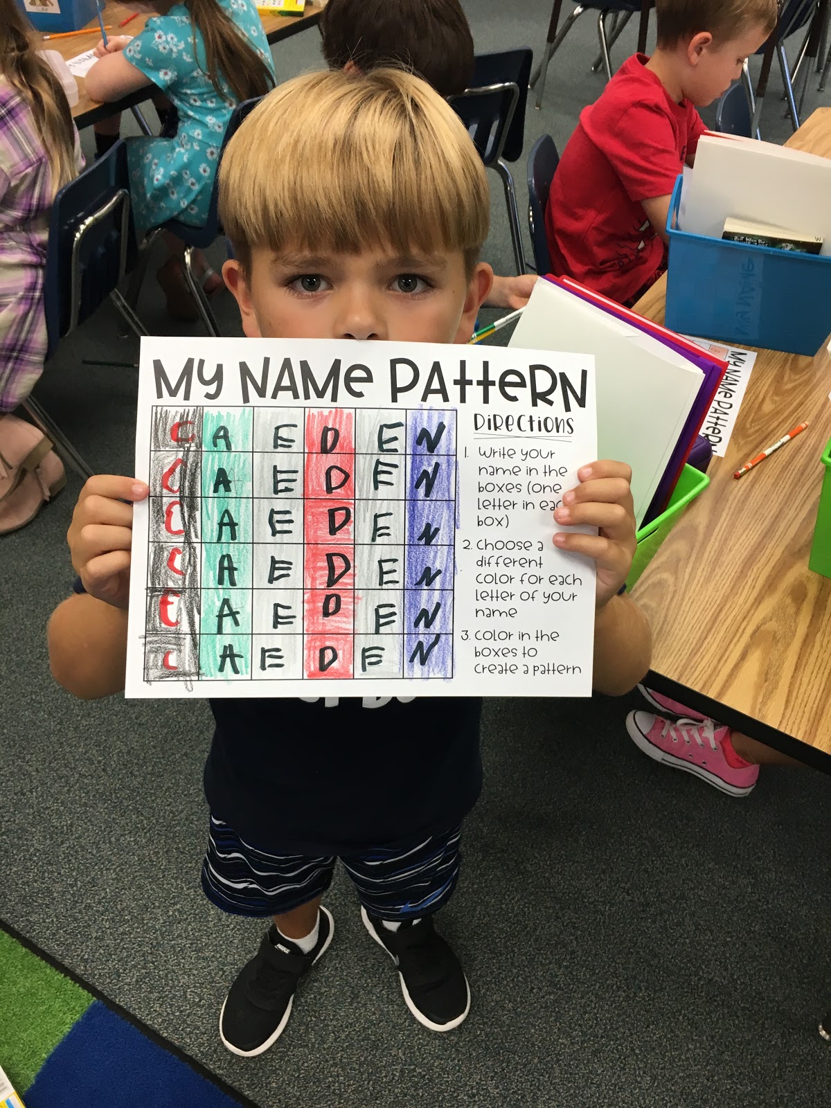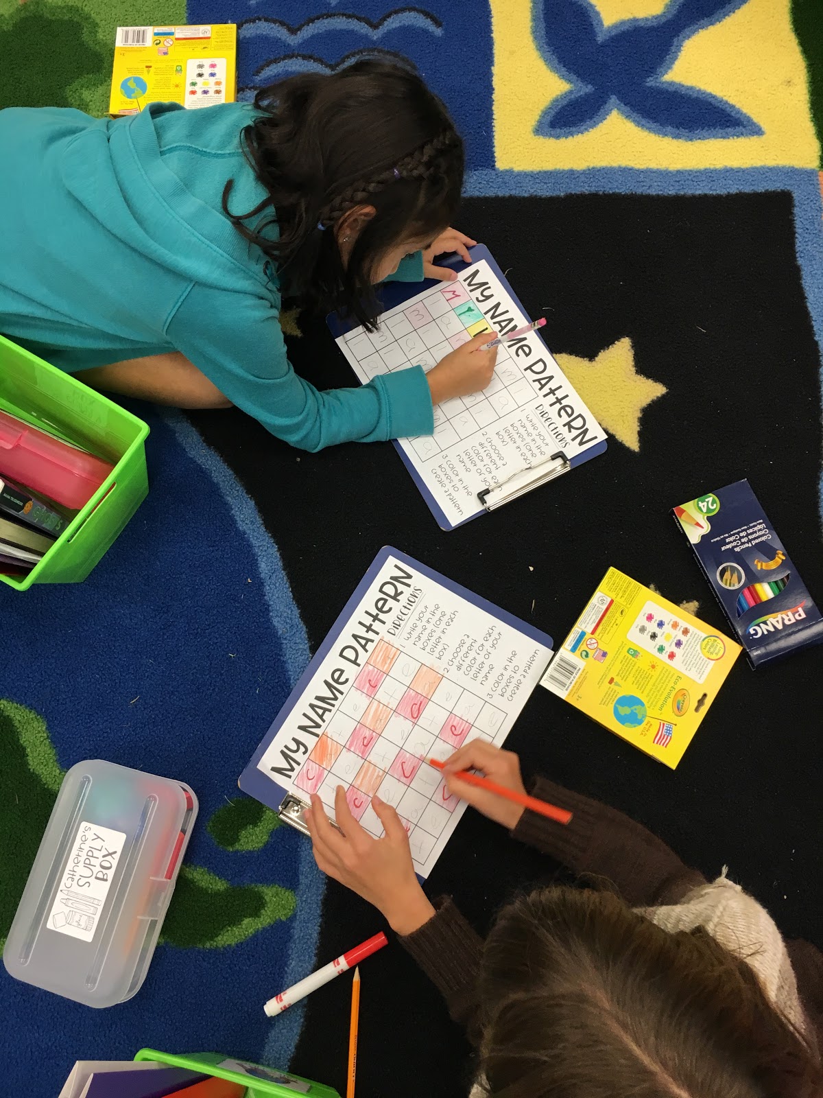 The first unit that we are doing in Math this year is patterns, so I gave them snap cubes and pattern blocks and after we practiced creating different kinds of patterns I had them complete this name pattern activity that you can grab for free here.