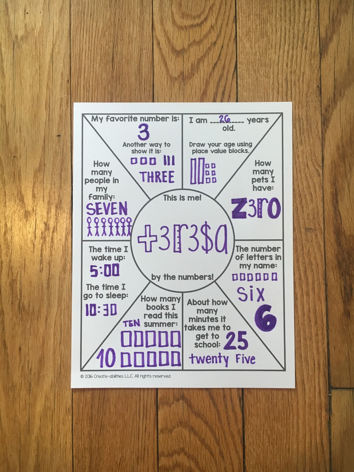 I split the kids up into groups and had them complete this free activity from Amy Groesbeck’s First Day of School Icebreakers called What’s Your Number. It required the group to ask each other questions involving numbers and do some simple addition and subtraction. This was a great opportunity for me to teach/model the right way to work with a group and it also helped to get the kids thinking about Math again!