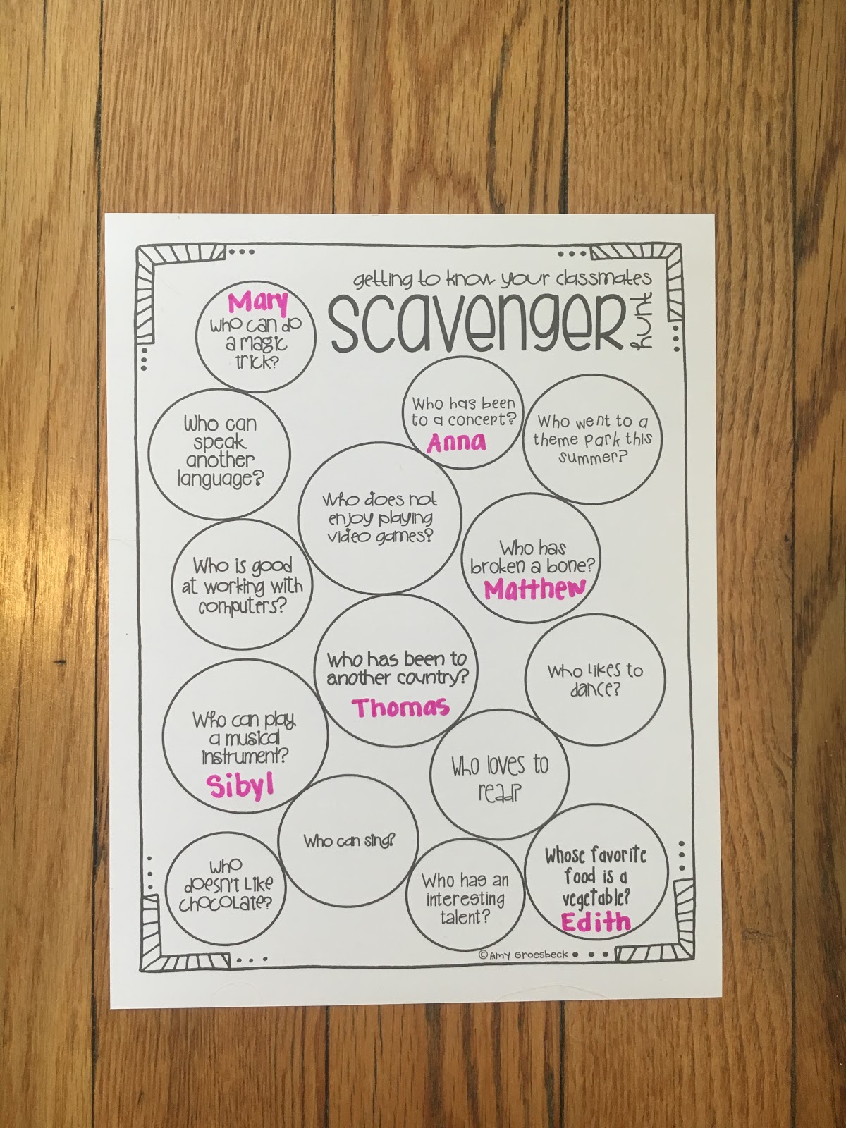 I gave each child a clipboard and a Scavenger Hunt sheet from Amy Groebeck’s First Day of School Icebreakers and had them travel around the room asking each other questions in order to fill up their page.