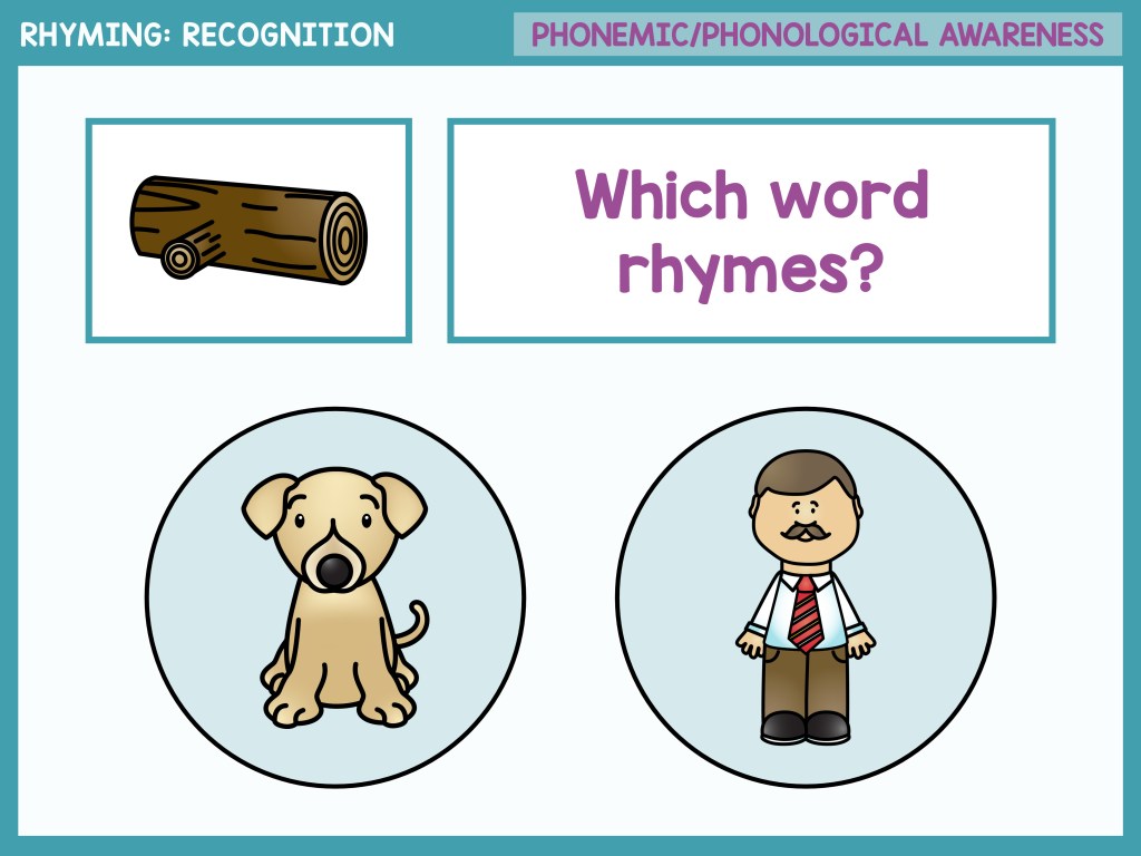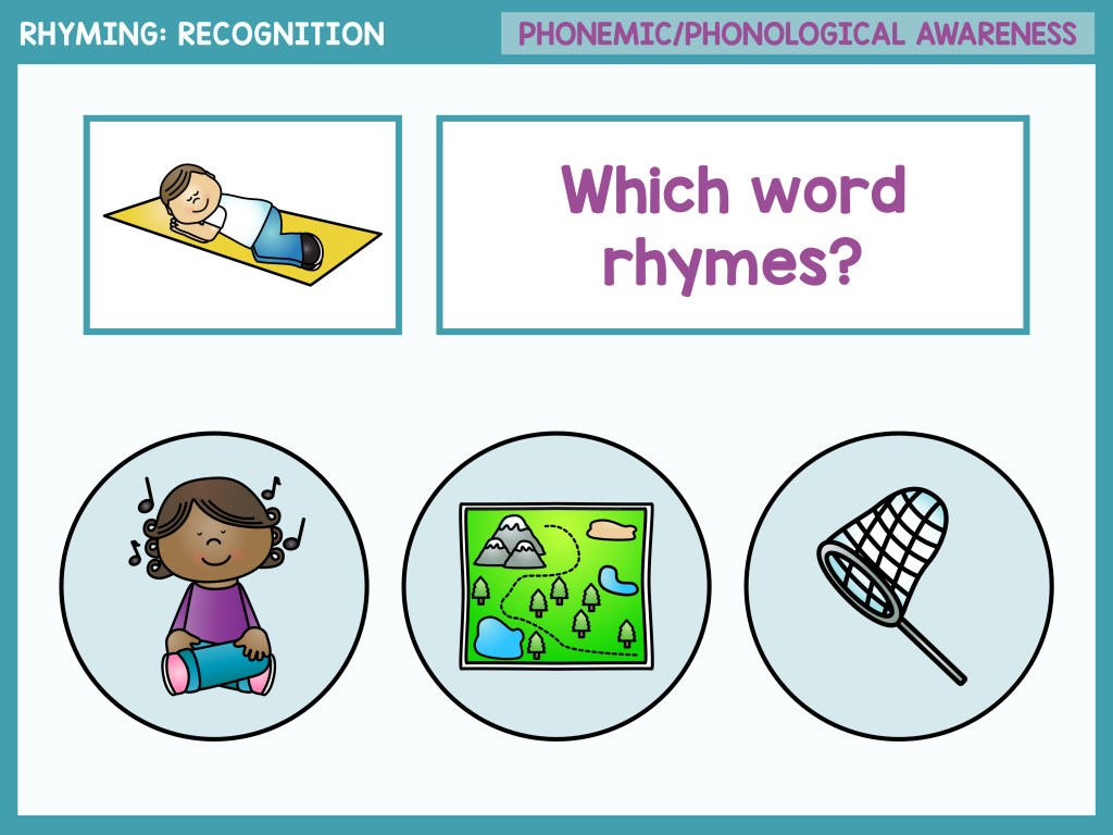 - On every other slide, the rhyming word will remain and the non-rhyming words will disappear to confirm the answer
