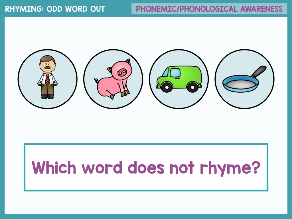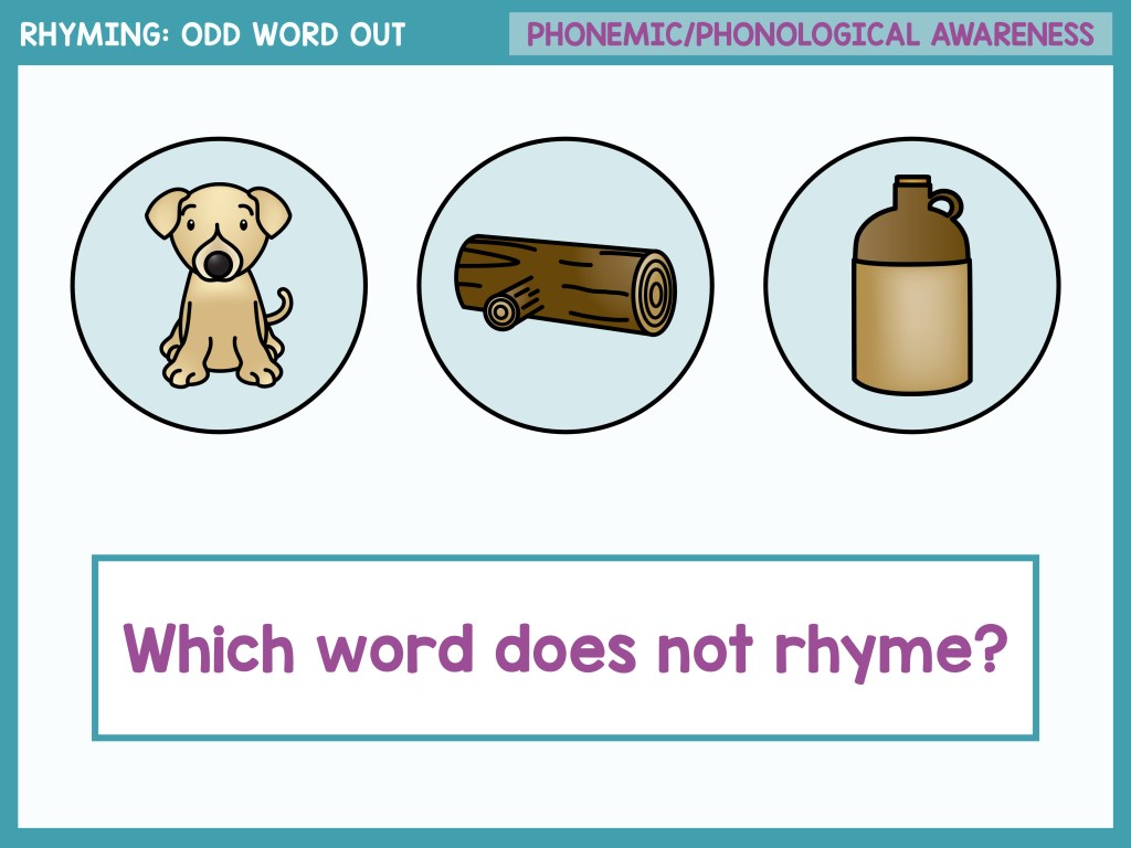 - On every other slide, the rhyming words will disappear and the oddity will remain to confirm the answer