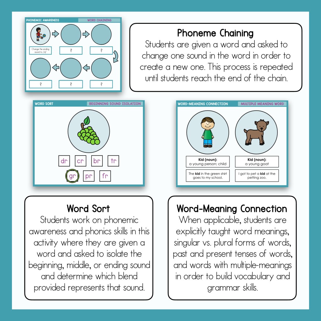 Each lesson includes a set of interactive slides that serve as a guide for your teaching. The slides incorporate spiral review of previously taught concepts, phonemic awareness activities, an introduction to new consonant blends, applied practice reading, spelling, and identifying consonant blends within words, and vocabulary work.